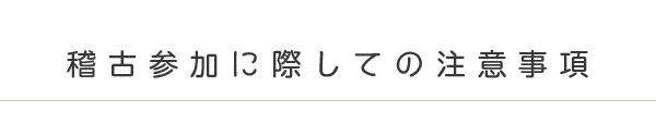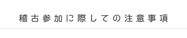 危険防止のためピアス、ネックレス、ヘアピン等のアクセサリー類をはずして稽古に参加してください。また、爪は短くしておく、裾や袖は適切な長さに調節しておくなど、その他危険予防をお願いします。