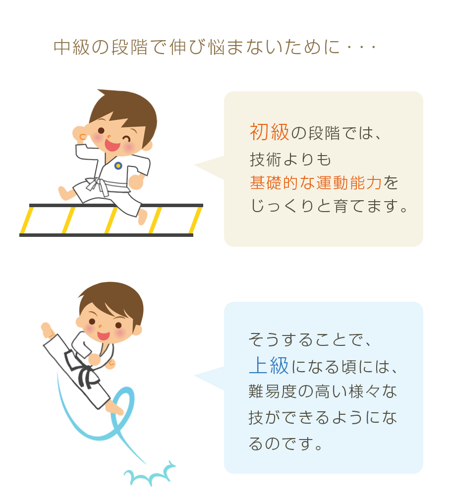 そのため道場の少年部(特に初級クラス)では、運動能力のもとをつくる「コーディネーショントレーニング」を練習に多く取り入れています。