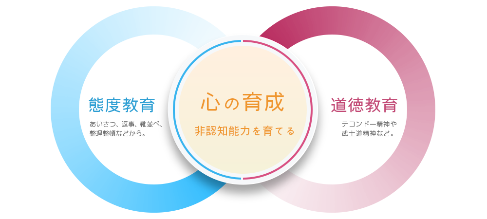 道場で掲げている心の育成の柱としているのは、コリアン武道であるテコンドーの5大精神と、日本古来の武士道の7つの徳です。