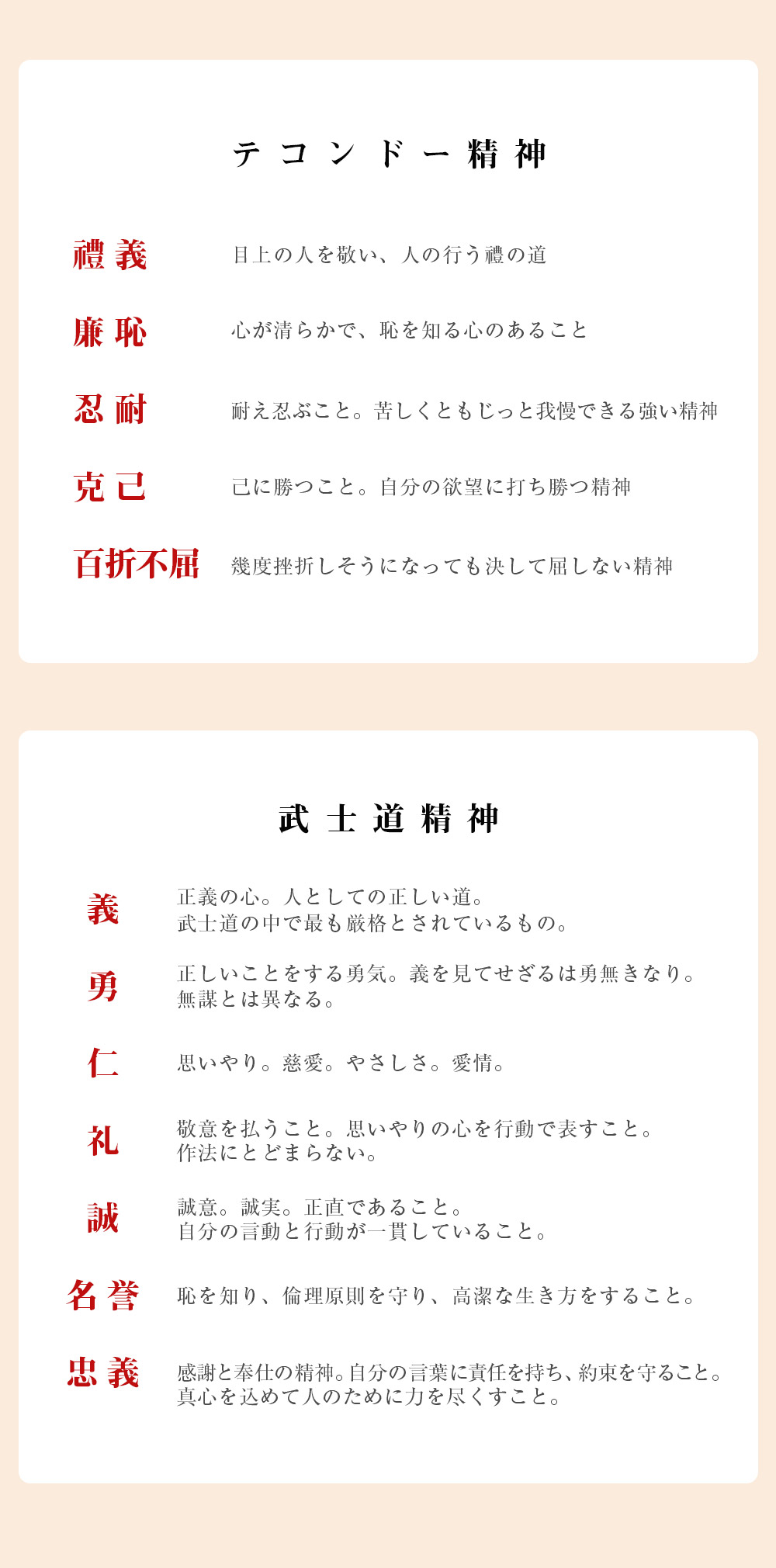 孔子が儒教で説いている5つの徳目(仁、義、礼、智、信)は、テコンドー精神にも武士道精神にも受け継がれていることが伺えます。