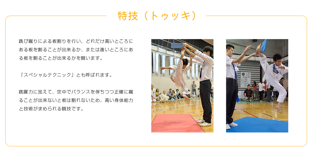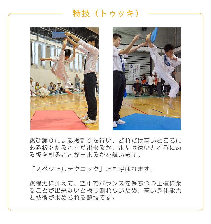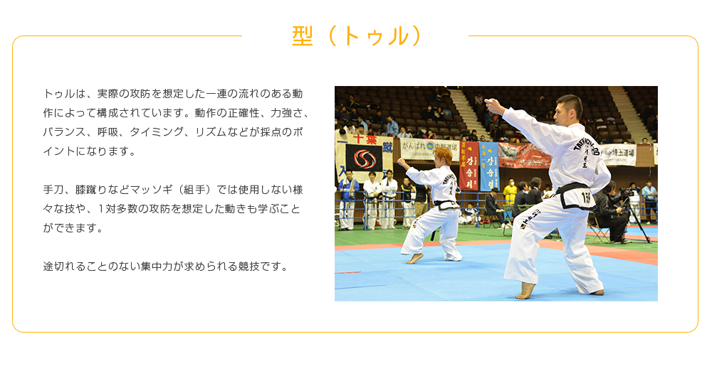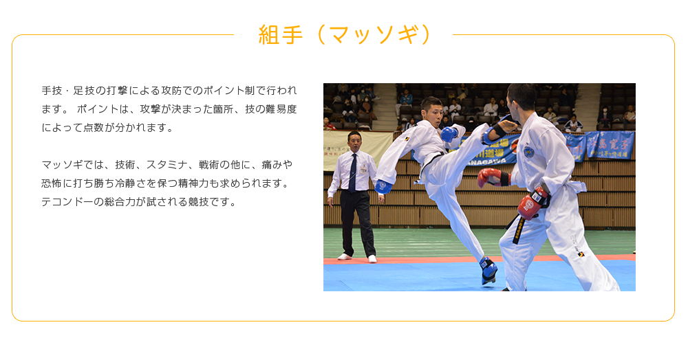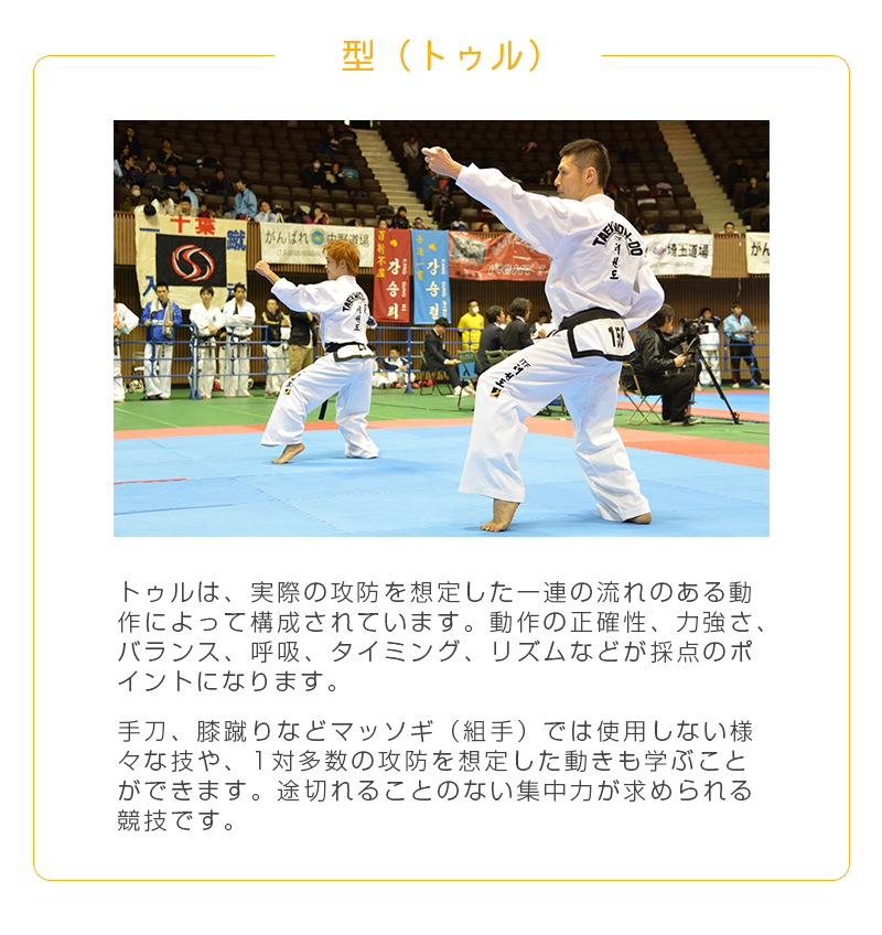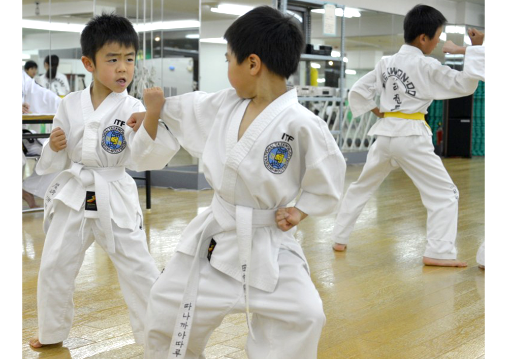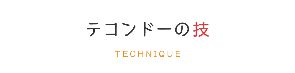 また、「足技」のイメージが強いテコンドーですが、「手技」も多いことはあまり知られていません。組手の中では「ジャブ」や「ストレート」といった直線的な「突き」の使用が認められています。また「型」稽古では、手刀、裏拳、肘など様々な部位を使った攻防を総合的に学びます。